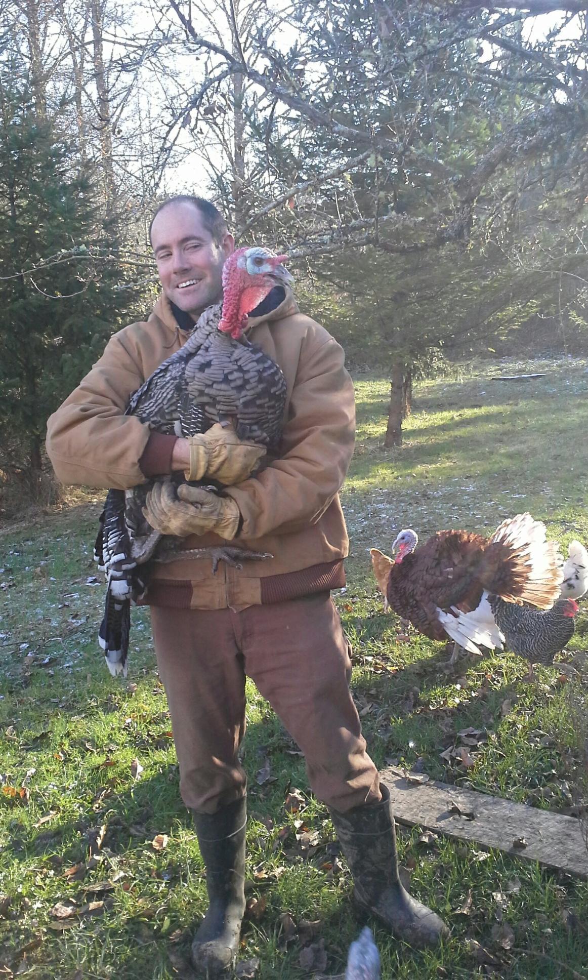 Our outdoor section of the chicken coop collapsed this weekend in a storm, and we had to let all the farm critters roam as we worked on fixing it. Mike picked up our biggest Tom turkey that I call Tommy Tommerson. Tommy is a Narragansett turkey and has grown quickly to nearly 20 pounds at 4 months old. He seems to be very healthy, happy and friendly so we are hoping that he will breed with our female “Reverse” so that we can have some baby Narragansetts this spring.